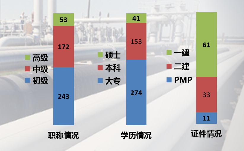 截止目前,公司現(xiàn)有員工1320余名。管理和專(zhuān)業(yè)技術(shù)人員468人,其中高級(jí)職稱(chēng)53人、中級(jí)職稱(chēng)172人、初級(jí)職稱(chēng)243人;碩士學(xué)歷41人、本科學(xué)歷153人、大專(zhuān)學(xué)歷274人;一級(jí)注冊(cè)建造師61人,二級(jí)注冊(cè)建造師33人,取得PMP證書(shū)11人。 技能操作人員850余名,其中高級(jí)技師5人,技師26人,高級(jí)工329人,中級(jí)工490余人。