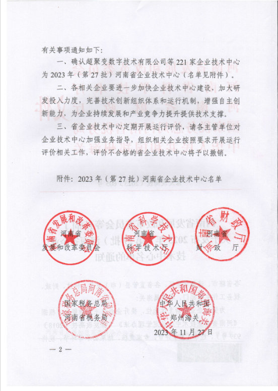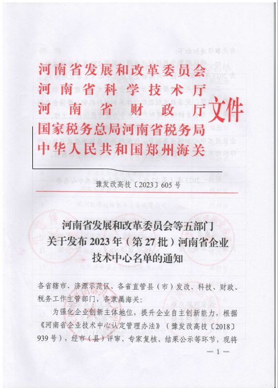 據(jù)豫發(fā)改高技[2023]605號文件公示,公司技術(shù)中心被河南省發(fā)改委等5部門評審為2023年(第27批)河南省企業(yè)技術(shù)中心.