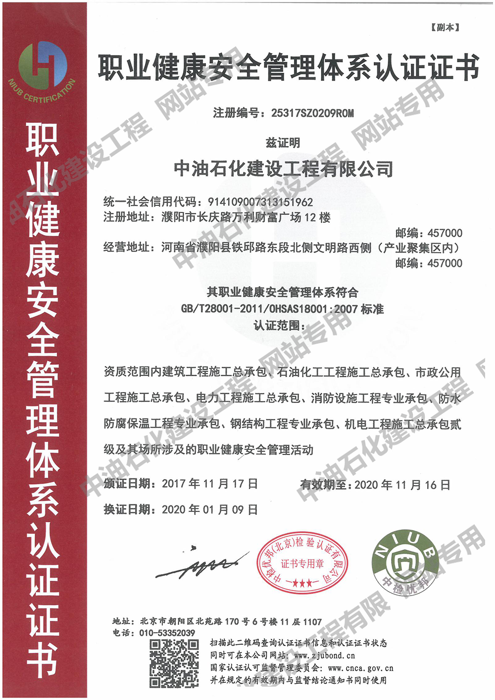 職業(yè)健康安全管理體系認(rèn)證證書